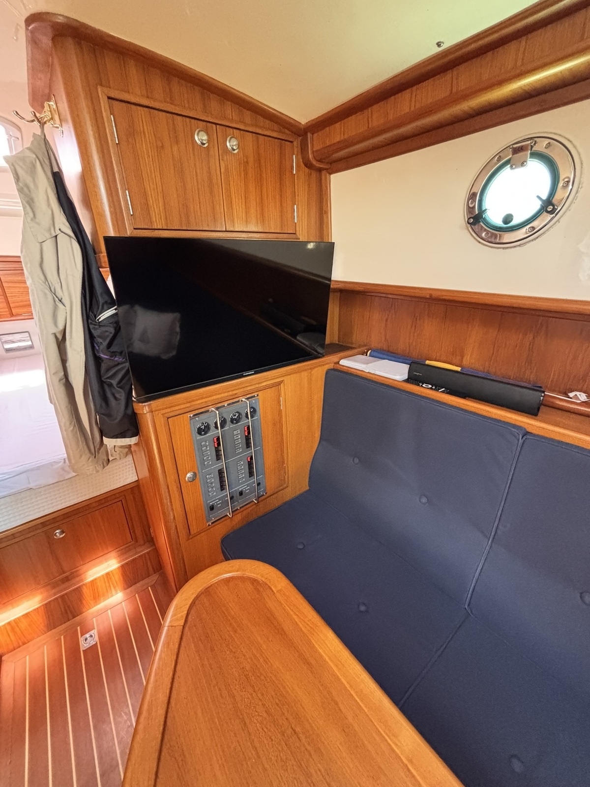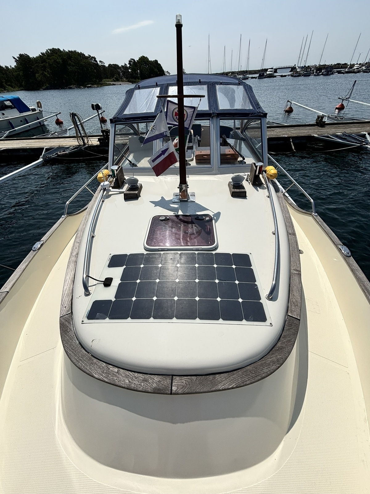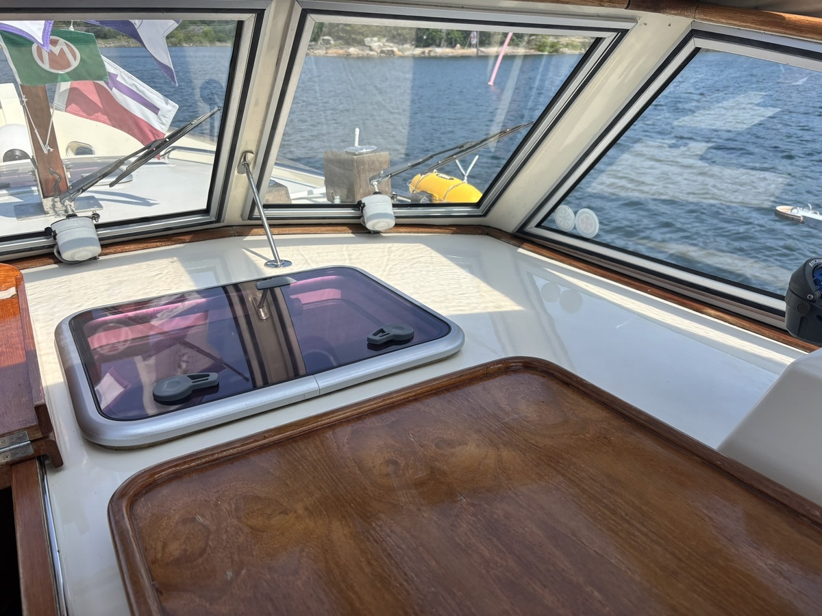 Romp en opbouw (niet het dek) zijn gespoten in mei 2024 met 5-7 lagen Jotun-kleur + vijf lagen blanke lak.