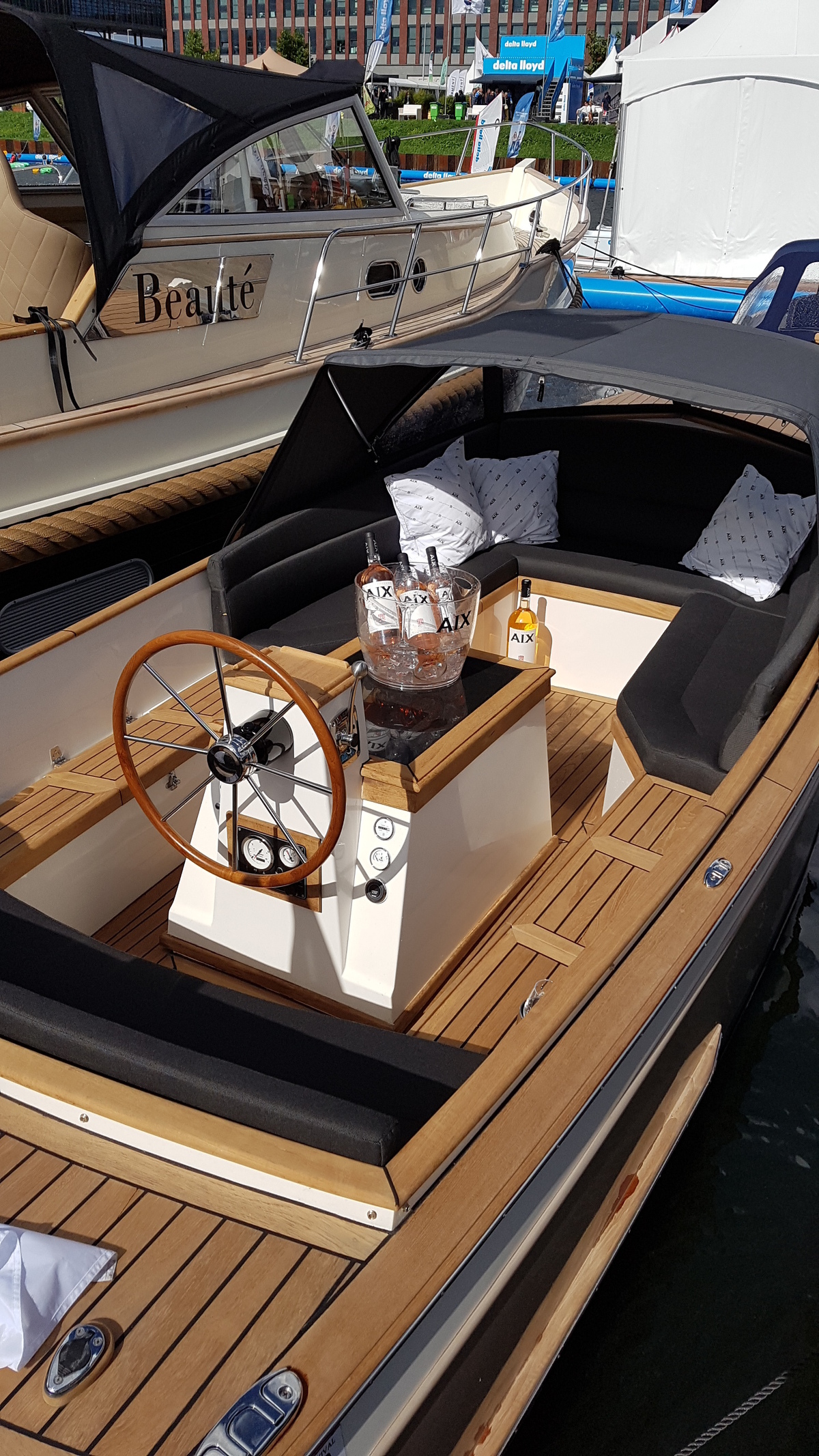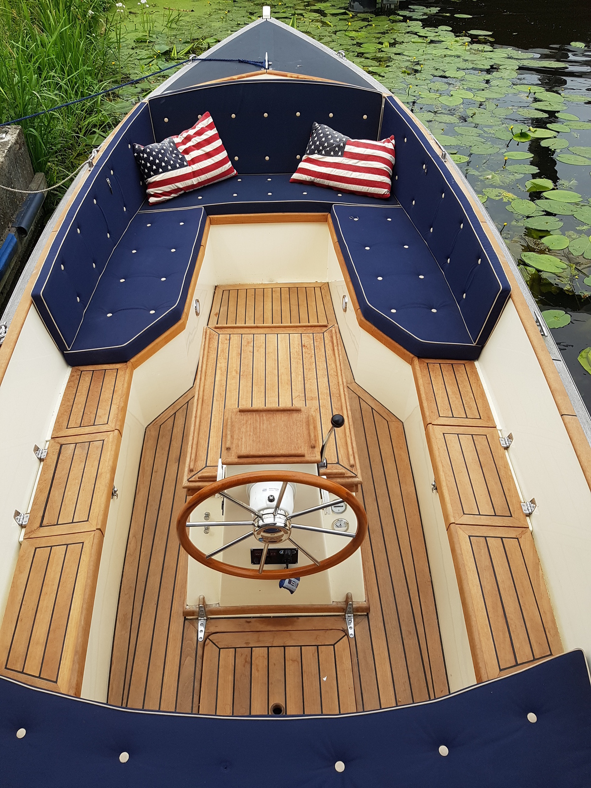 Teak op het motorluik met massief lijstwerk